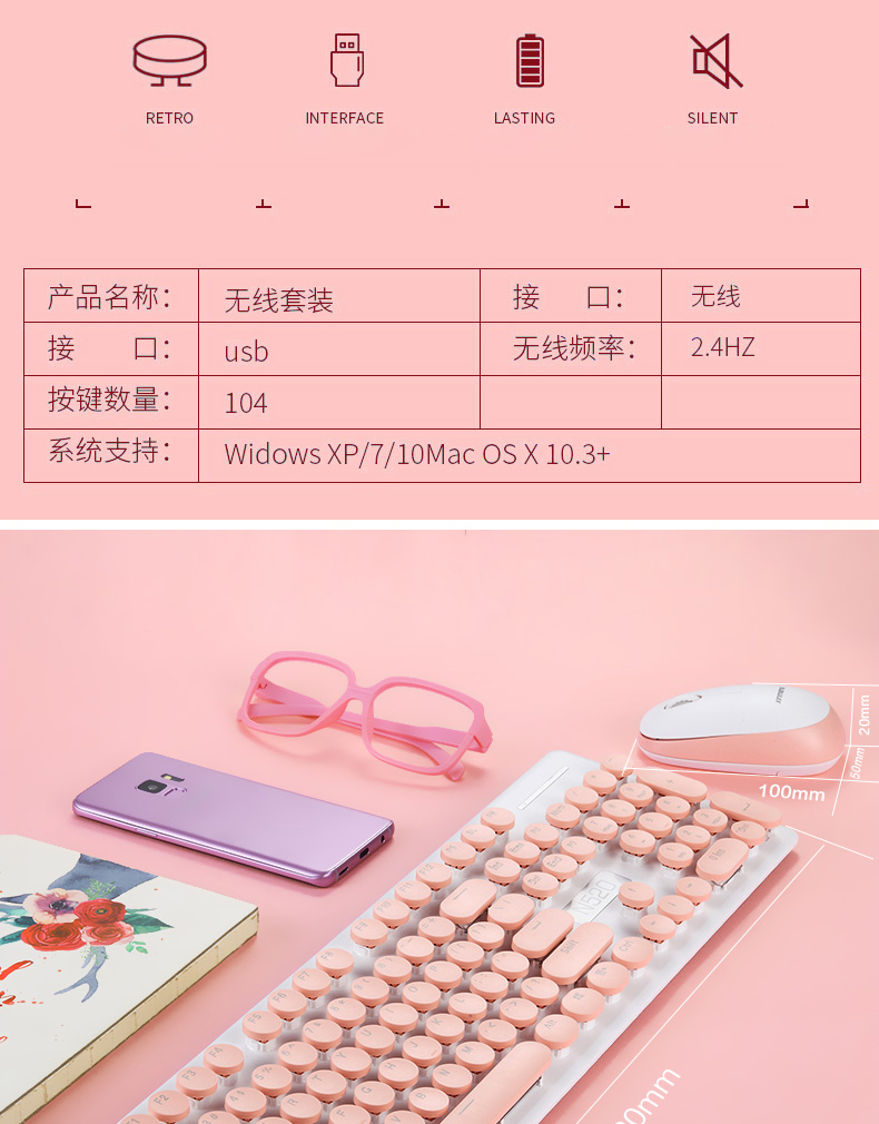 Technology(Technology)N 520レトロで超薄型ワイヤスキーボーマウスセットオフィスビジネス女子ノートパソコン静音キーマウス薄淡雅粉