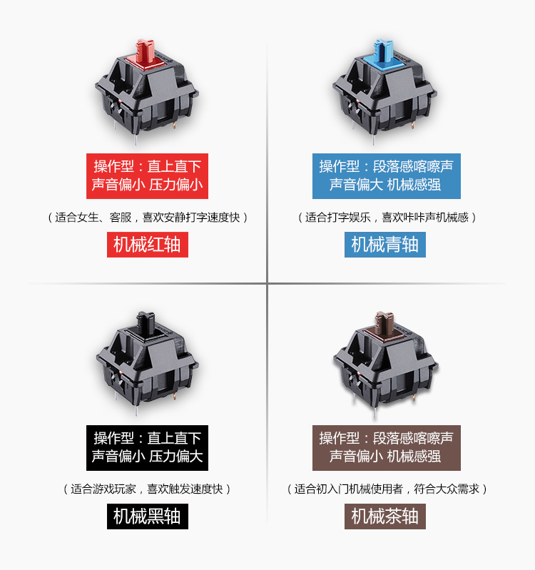 、茶軸、黒軸、赤軸4種のメカニカルキーボードが自由選択できる。通常仕事用から